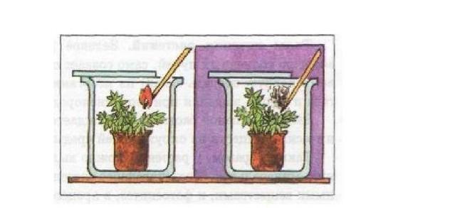 Ученики провели опыт: Взяли два сосуда с зелеными растениями, первое стояло на свету, второе в темноте. При поднесении зажженной спички к сосуду с растением, которое стоит на свету спичка горела хорошо, а во втором случае огонь потух. Объясните почему?