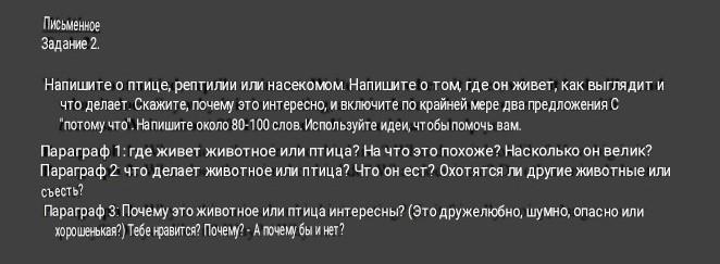 Write about a bird, reptile or insect. Write about where it lives, what it looks like and what it does. Say why it is interesting, and include at least two sentences with because. Write about 80-100 words. Use the ideas to help you.