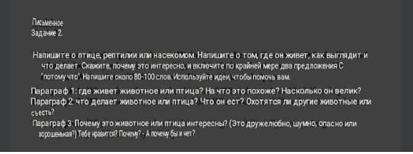 Write about a bird, reptile or insect. Write about where it lives, what it looks like and what it does. Say why it is interesting, and include at least two sentences with because. Write about 80-100 words. Use the ideas to help you.