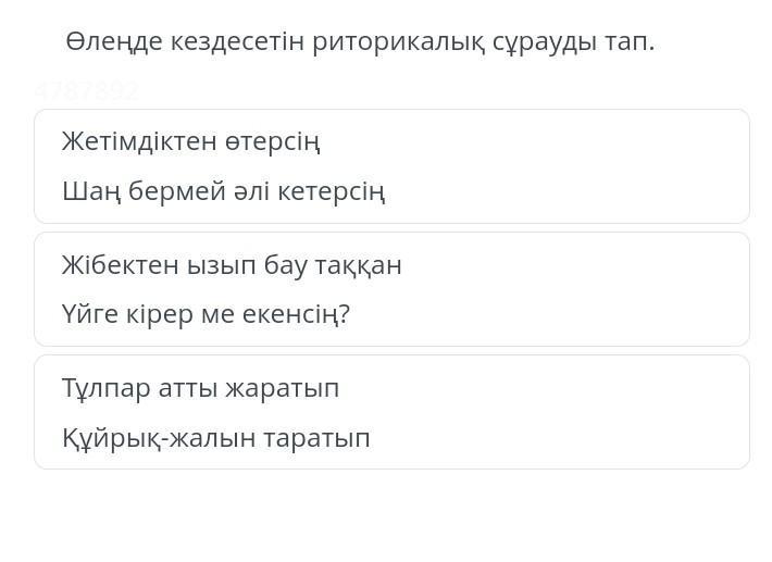 Өлеңде кездесетін риторикалық сұрауды тап. Жетімдіктен өтерсің Шаң бермей әлі кетерсің Жібектен ызып бау таққан Үйге кірер ме екенсің? Тұлпар атты жаратып Құйрық-жалын таратып