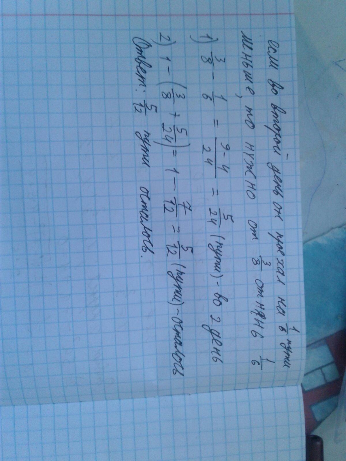 Поезд в первый день проехал 3/8 всего пути, а во второй день на 1/6 меньше, чем в первый. Какую часть пути поезд проехал за два дня? Какую часть пути ему осталось проехать?