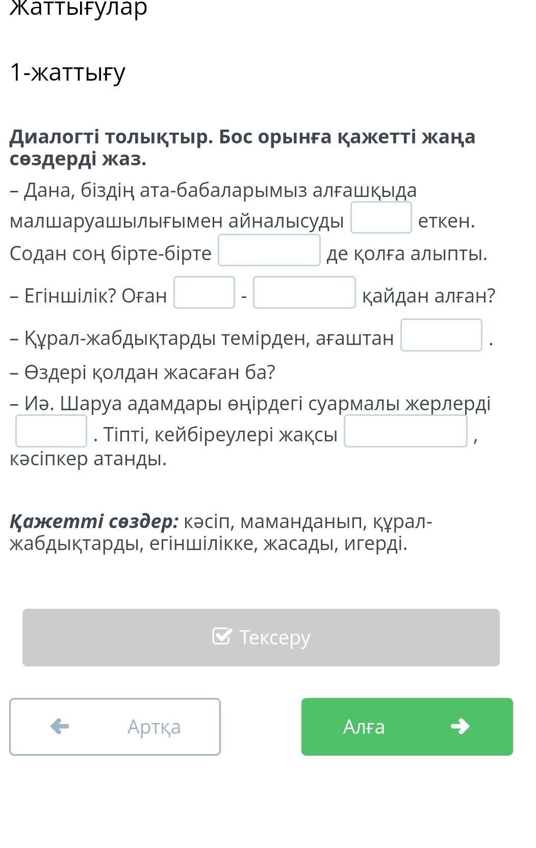 Диалогті толықтыр. Бос орынға қажетті жаңа сөздерді жаз.