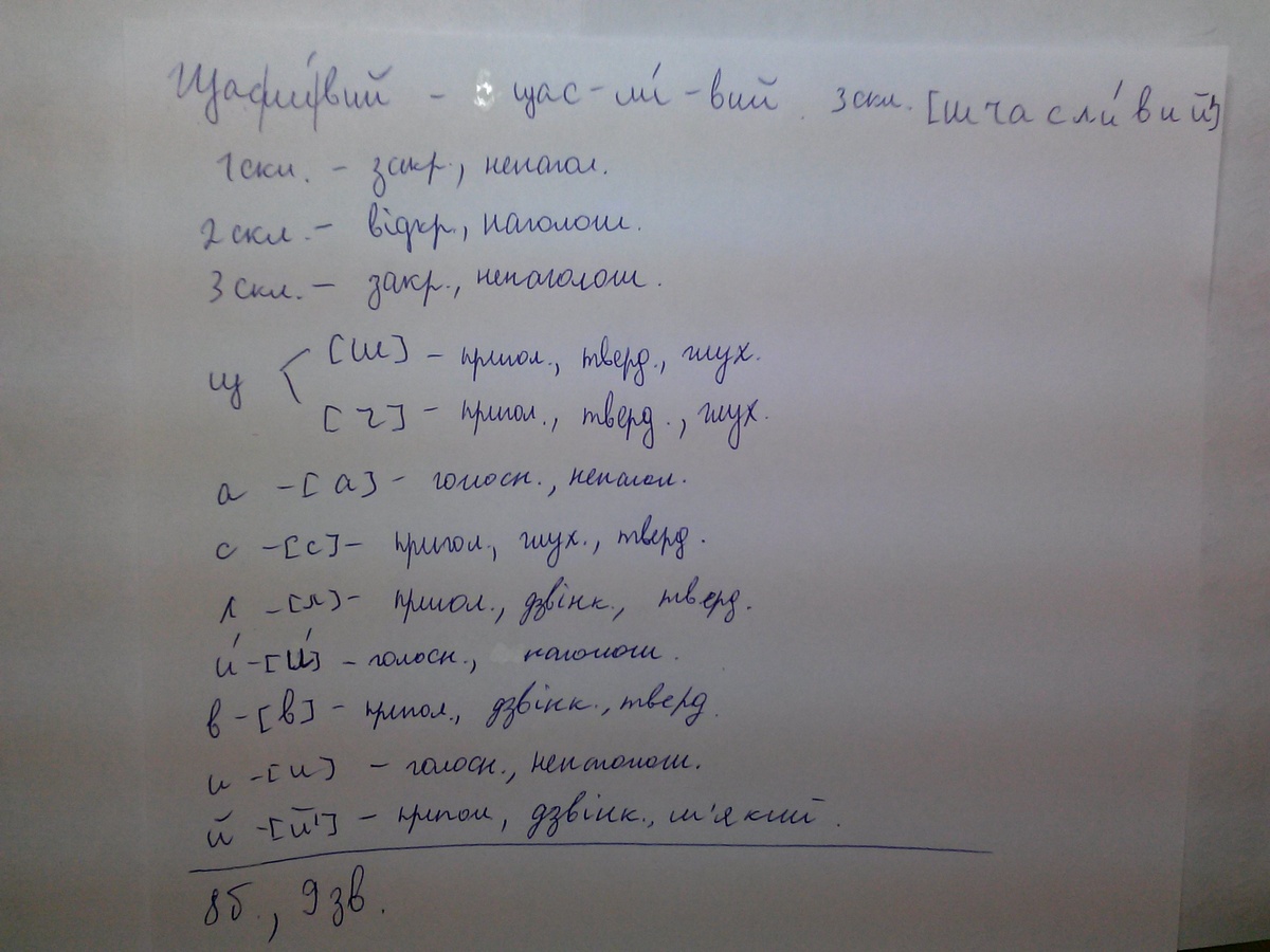 надо слово Щасливий сделать так например: Ведмідь (веид/мід)-- 2 склади обидва закртиті другий склад наголошений в---(в)--- пригол дзвінкий твердий е---(еи)---голосн ненагол д---(д)---пригол дзвінкий твердий м---(м)---пригол дзвінкий помякшений і---(і)---голосн нагол д---(д)---пригол дзінкий мякий