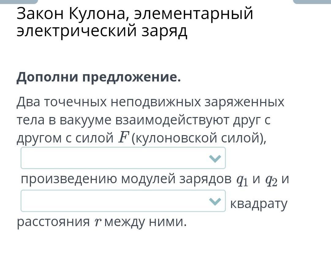Два точечных неподвижных заряженных тела в вакууме взаимодействуют друг с другом с силой F (кулоновской силой), (прямо пропорциональной/обратно пропорциональной)