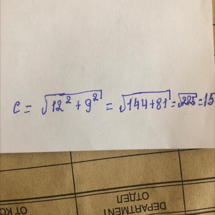 9=3*3; 12=3*4; значит c=3*5=15. Так как (3;4;5) - знаменитый треугольник. Можно и по т. Пифагора. с*с=9*9+12*12=81+144=225; с=15.