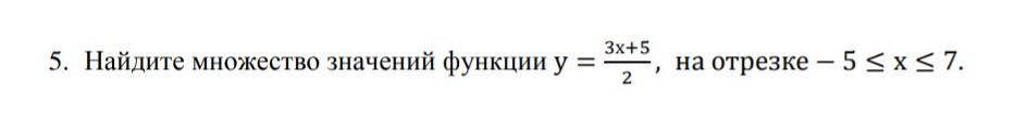 y=\frac{3x+5}{2}\\\\-5\leq x\leq7\\\\y=\frac{3*(-5)+5}{2}=\frac{-15+5}{2}=\frac{-10}{2} =-5\\\\y=\frac{3*7+5}{2}=\frac{21+5}{2}=\frac{26}{2}=13\\\\Otvet:\boxed{y\in[-5;13]}