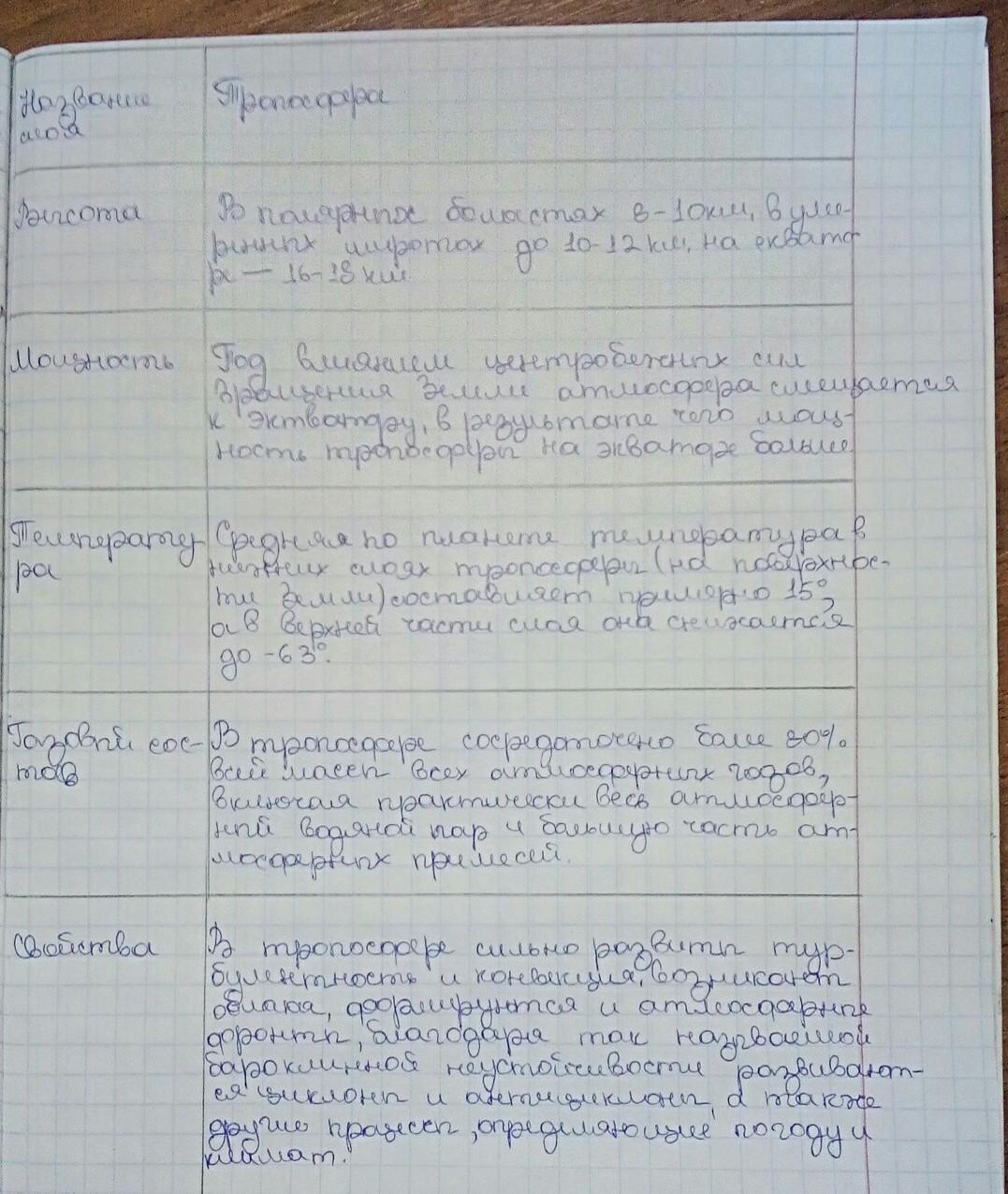 Заполните таблицу характеристики тропосферы по плану