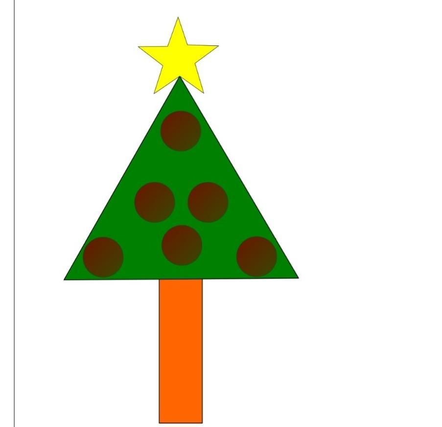 Рисунок не интересный. Сделан из геометических фигур, разного цвета. Это елка на которой весят герлянды, а сверху звезда, и ствол. Видно, что она настоящяя, а не искусственная
