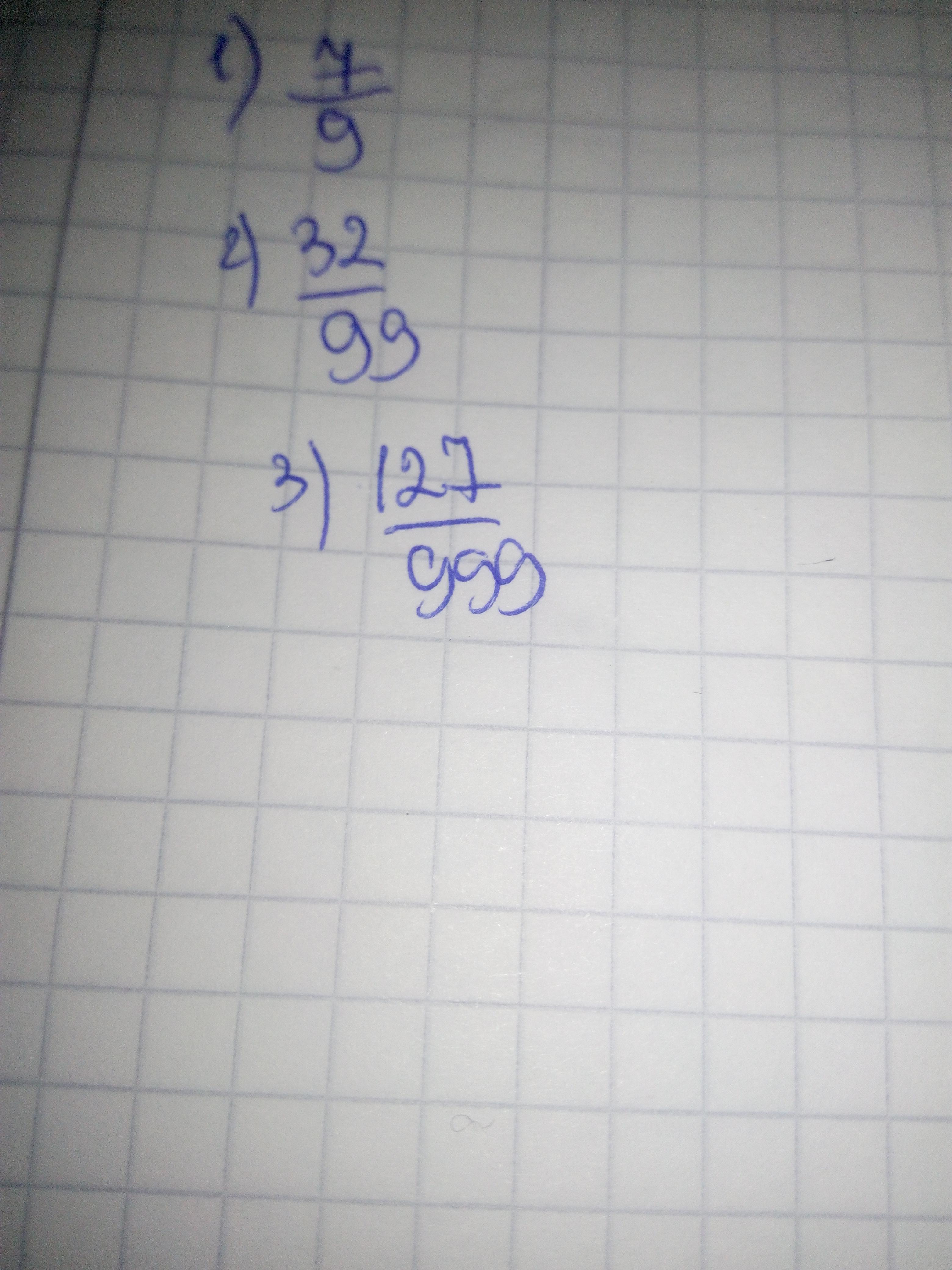 Запишите переодическую десятичную дробь в виде обыкновенной. 0, (7) , 0, (32), 0,(127)