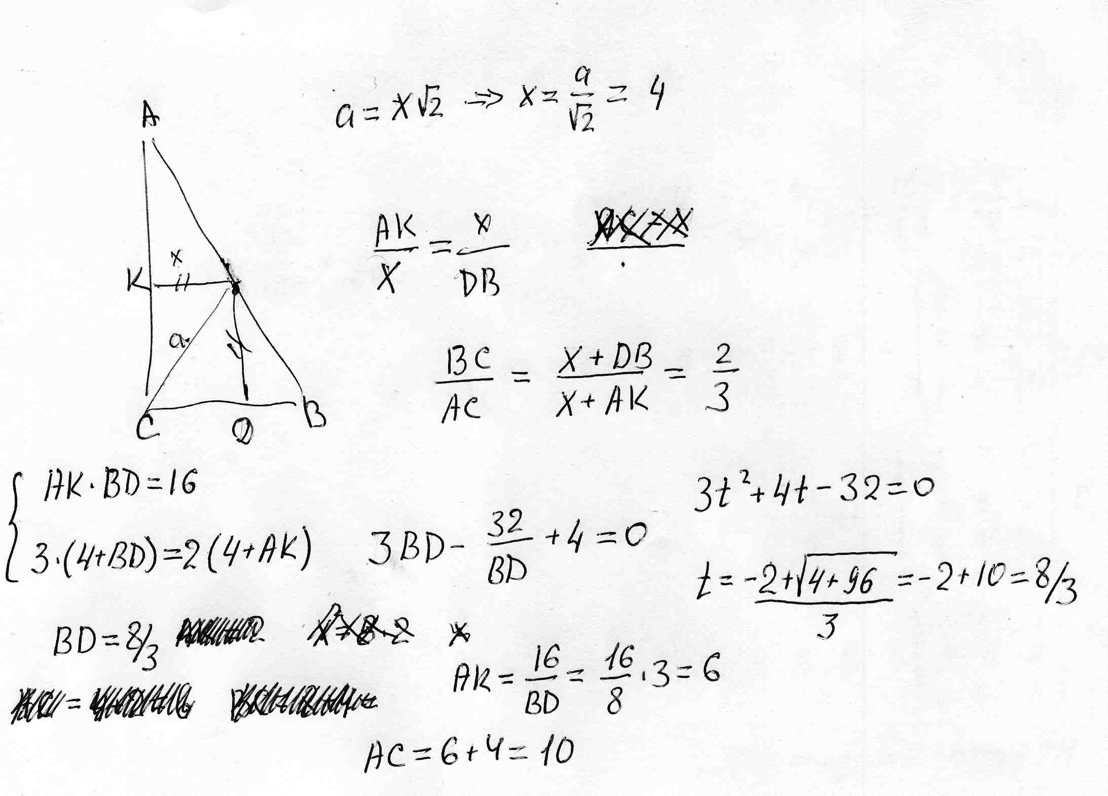точка, принадлежащая гипотенузк прямоугольного треугольника, равноудалена от обоих катетов.расстояние от данной точки до вершины прямого угла треугольника равно 4 корня из 2, а длины катетов относятся как 2:3.найдите длину большего катета