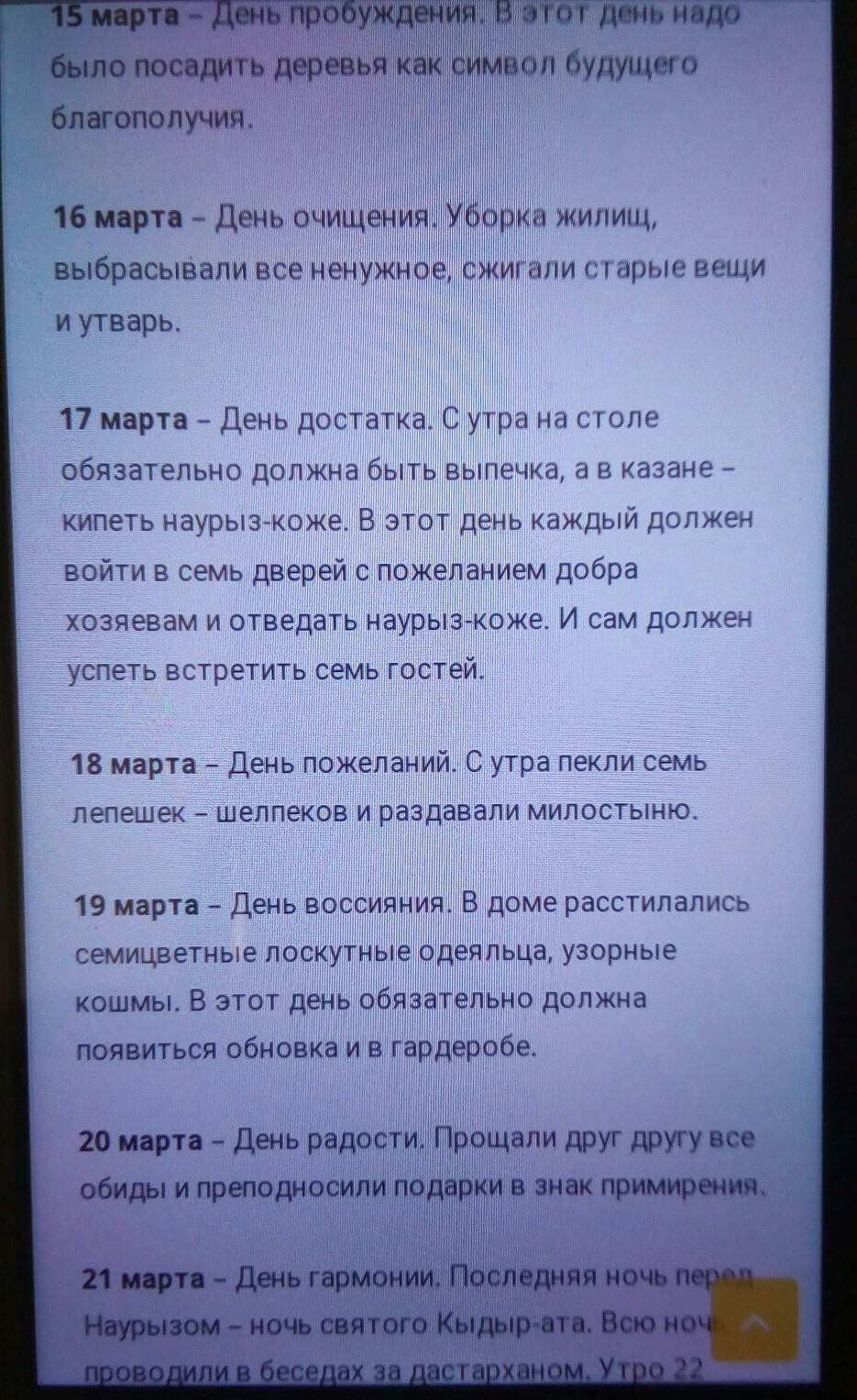 и 21 марта- день радости. Последняя ночь перед Наурызом - ночь святого Кыдыр-ата. Всю ночь проводили в беседах за дасторханом . Утро 22 марта в древности встречали подняв ладони к небу