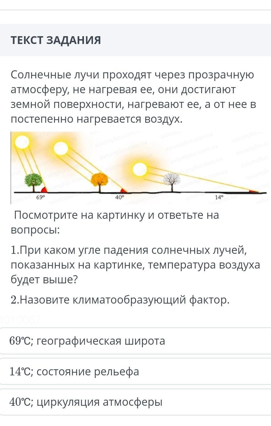 Солнечные лучи проходят через прозрачную атмосферу, не нагревая ее, они достигают земной поверхности, нагревают ее, а от нее в постепенно нагревается воздух. Посмотрите на картинку и ответьте на вопросы: 1. При каком угле падения солнечных лучей, показанных на картинке, температура воздуха будет выше? 2. Назовите климатообразующий фактор. 69°C; географическая широта 14*C; состояние рельефа 40