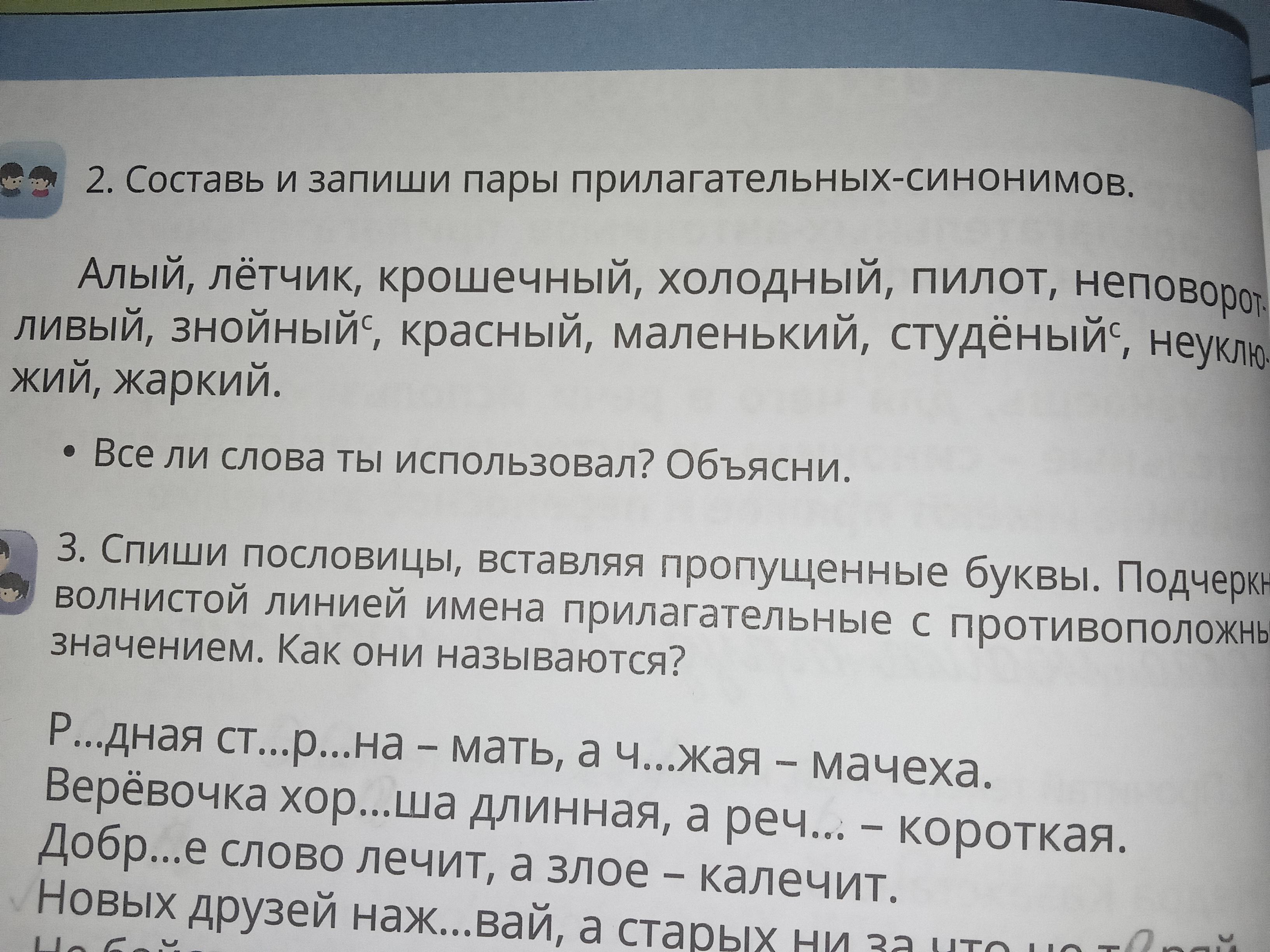 2 Алый-красный, лётчик-пилот, крошечный-маленький, холодный-студёный, неповоратливый-неуклюжий, знойный-жаркий.