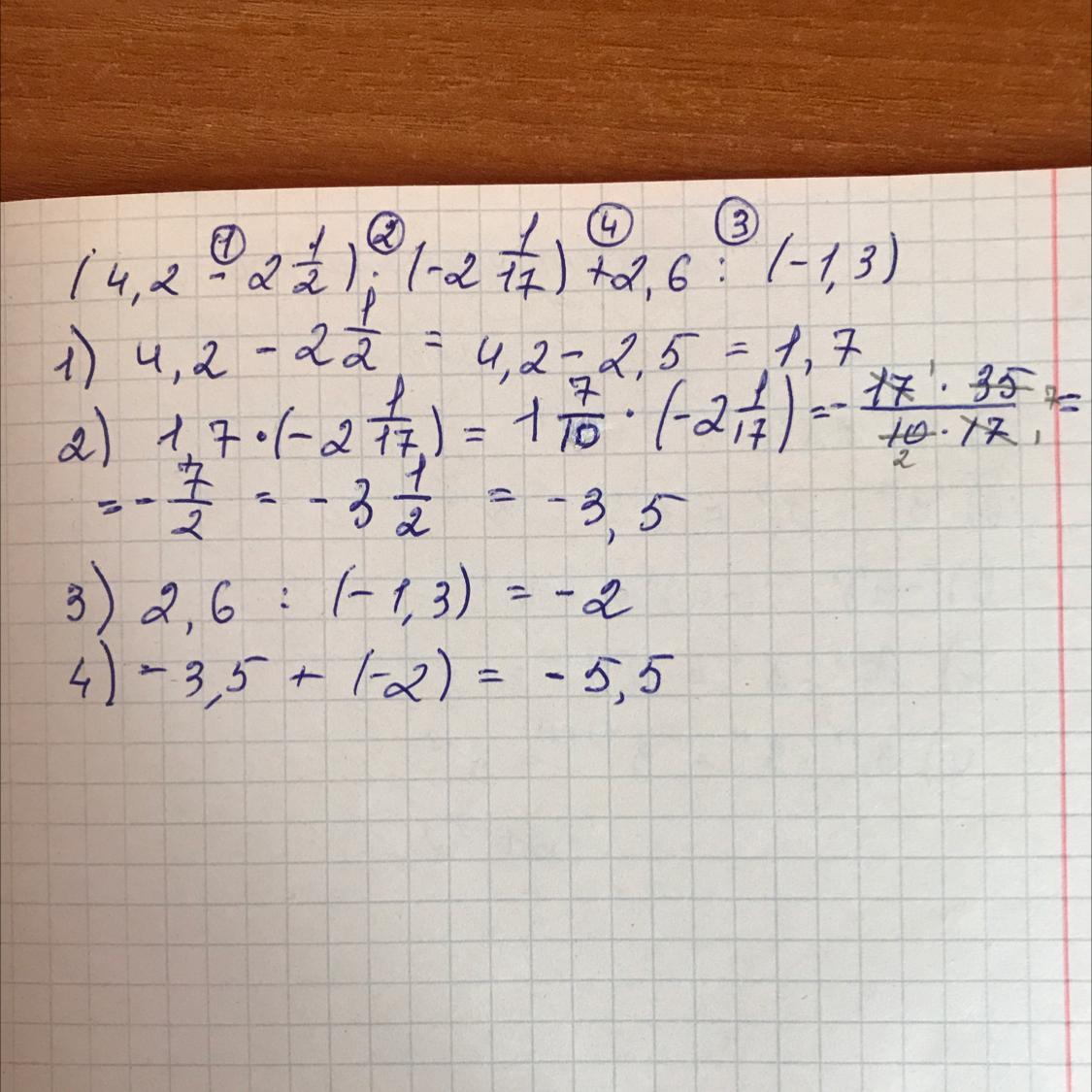 (4,2 – 2 1/2)*(-2 1/17) + 2,6: (-1,3)
