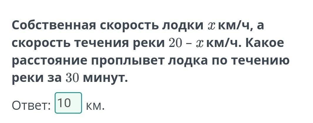 Собственная скорость лодки x км/ч, а скорость течения реки 20 – x км/ч. Какое расстояние проплывет лодка по течению реки за 30 минут.