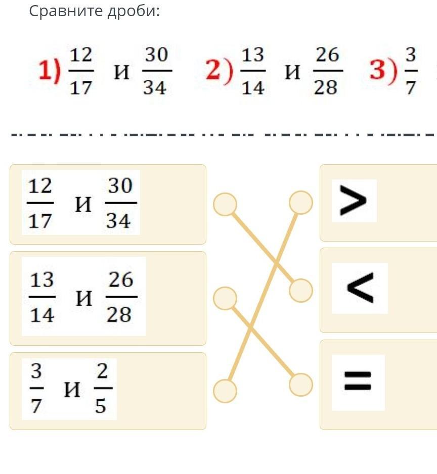 Ответ: 1) < потому что при приведении к общему знаменателю 17, дроби будут выглядеть так 12/17 и 15/17.