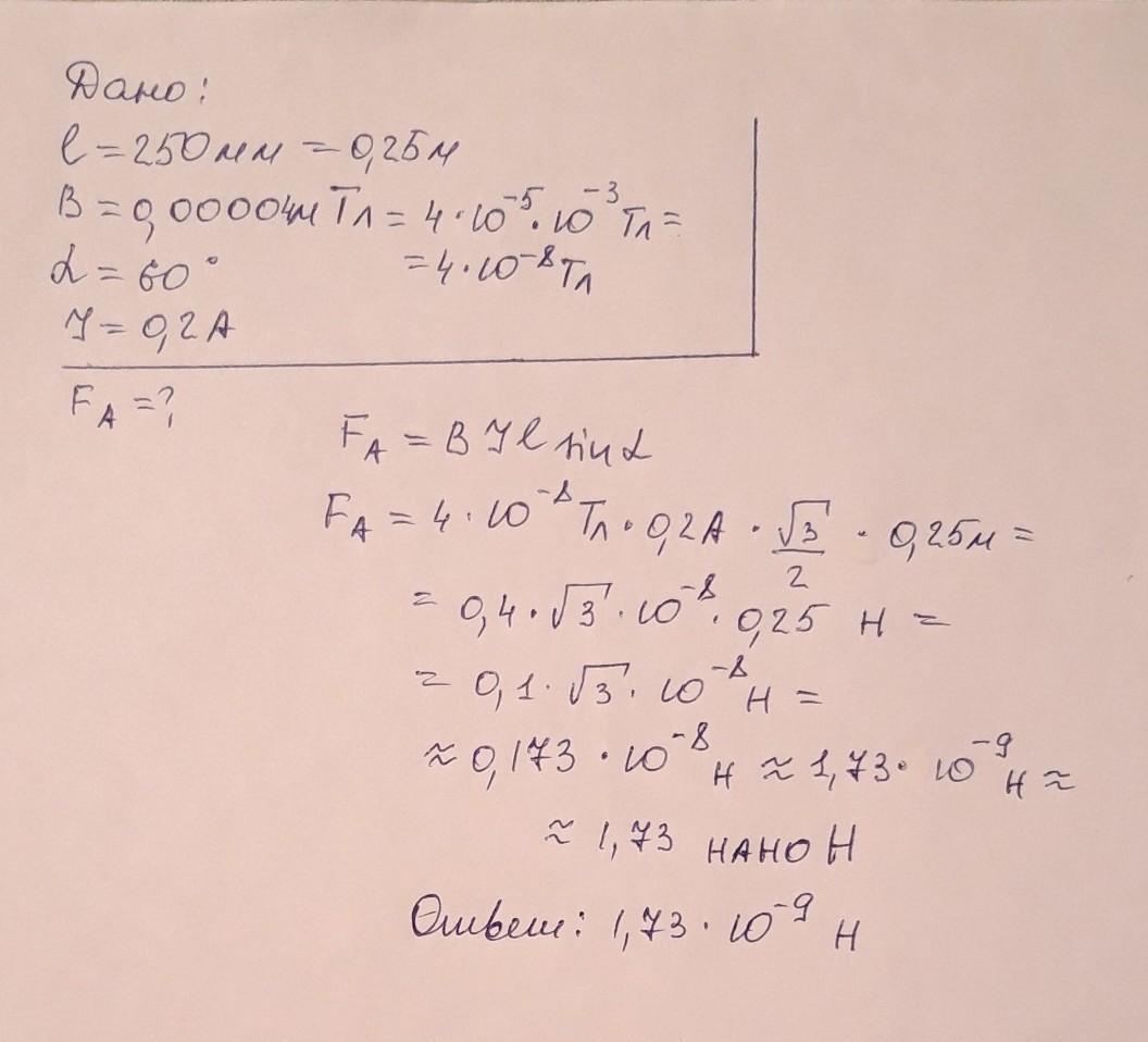 Определить модуль силы ампера, действующей на проводник с током длиной 250 мм в магнитном поле с индукцией 0,00004 мТл, если угол между вектором магнитной индукции и направлением тока 60 градусов. Сила тока в проводнике 0,2 А