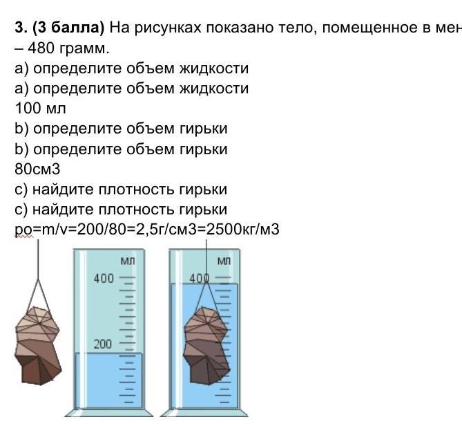 (3 балла) На рисунках показано тело, помещенное в мензурку с водой. Масса тела – 480 грамм.