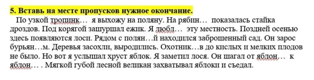 По узкой тропинкЕ я выхожу на поляну. На рябинЕ показалась стайка дроздов. Под корягой зашуршал ёжик. Я люблЮ эту местность. Поздней осенью здесь проявляются лоси. Рядом с полянОй находился заброшенный сад. Он зарос бурьянОм. Деревья засохли, выродились. ОхотникОв до кислых и мелких плодов не было. Но вот я услышал хруст яблок. Я заметил лося. Он шагал от яблонИ к яблонЕ. Мягкой губой лесной великан захватывал яблоки и съедал