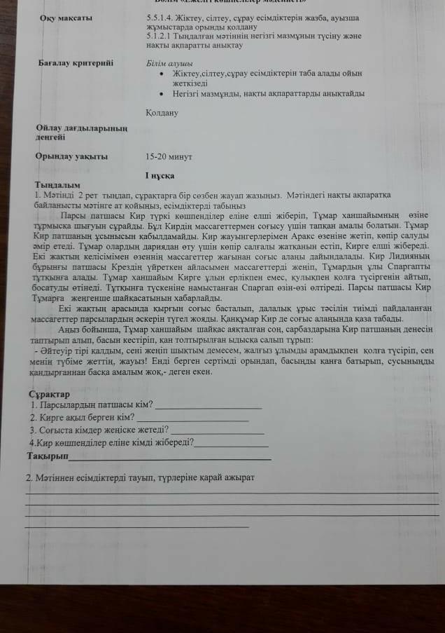Есімдіктер: Кир патша, Тұмар ханшайым,Спарғап,Крез патша,массагеттер,ерлікпен,қулықпен.