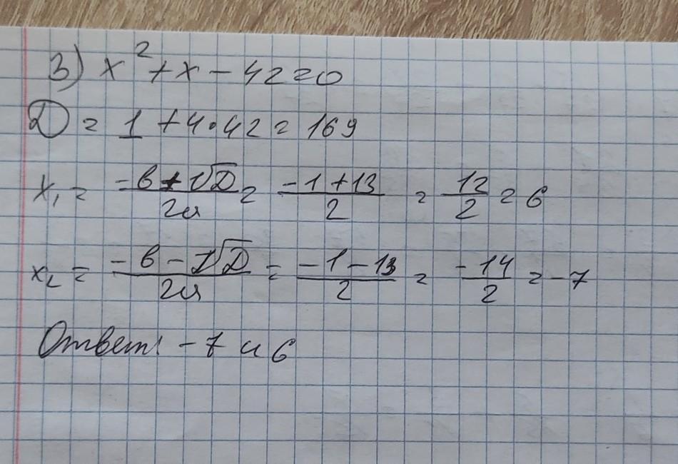 D = b²-4ac = 1²-4×1×(-42) = 1+168 = 169 = 13².