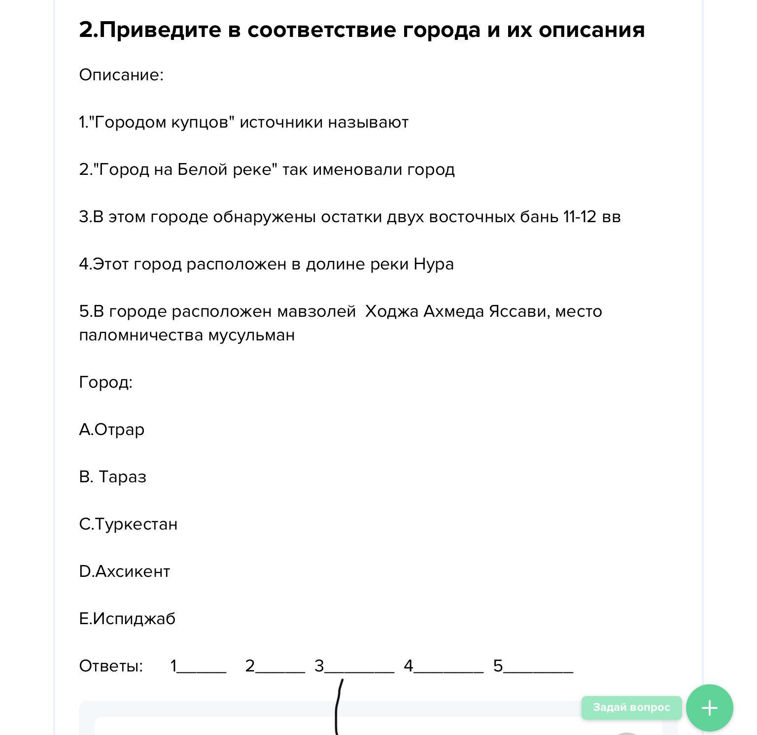 2.Приведите в соответствие города и их описания Описание Город 1 "Городом купцов" источники называют А.Отрар 2 "Город на Белой реке" так именовали город В. Тараз 3 В этом городе обнаружены остатки двух восточных бань 11-12 вв. С.Туркестан 4 Этот город расположен в долине реки Нура D.Ахсикент 5 В городе расположен мавзолей Ходжа Ахмеда Яссави, место паломничества мусульман. E.Испиджаб Ответы: 1_____ 2_____ 3_______ 4_______ 5_______ помогите пжжжжжжжжжжжжж
