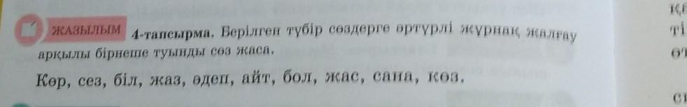 4-тапсырма. Берілген түбір сөздерге әртүрлі жұрнақ жалғау арқылы бірнеше туынды сөз жаса.
