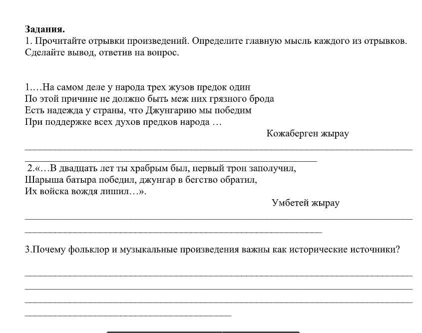 Задания. 1. Прочитайте отрывки произведений. Определите главную мысль каждого из отрывков. Сделайте вывод, ответив на вопрос. 1.…На самом деле у народа трех жузов предок один По этой причине не должно быть меж них грязного брода Есть надежда у страны, что Джунгарию мы победим При поддержке всех духов предков народа … Кожаберген жырау _____________________________________________________________________________ __________________________________________________________ 2.«…В двадцать лет ты храбрым был, первый трон заполучил, Шарыша батыра победил, джунгар в бегство обратил, Их войска вождя лишил…». Умбетей жырау _____________________________________________________________________________ ___________________________________________________________ 3.Почему фольклор и музыкальные произведения важны как исторические источники? _____________________________________________________________________________ _____________________________________________________________________________ _____________________________________________________________________________ _________________________________________