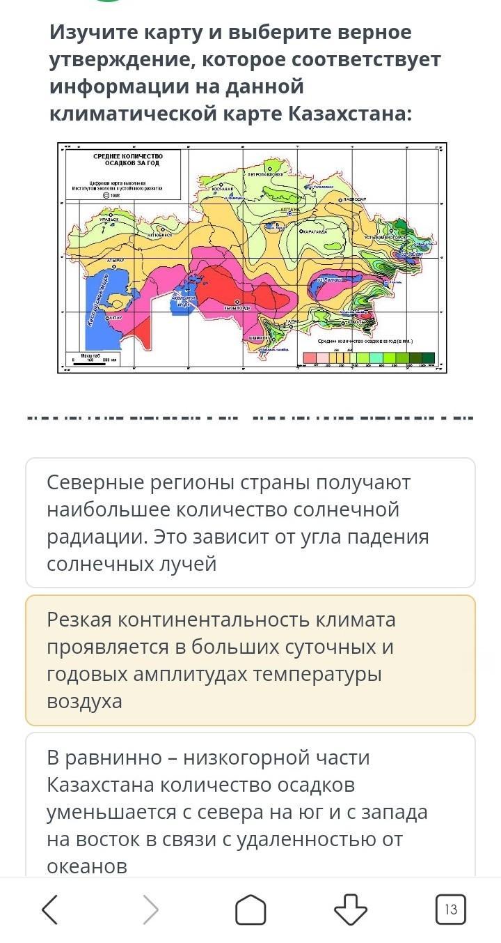 Изучите карту и выберите верное утверждение, которое соответствует информации на данной климатической карте Казахстана