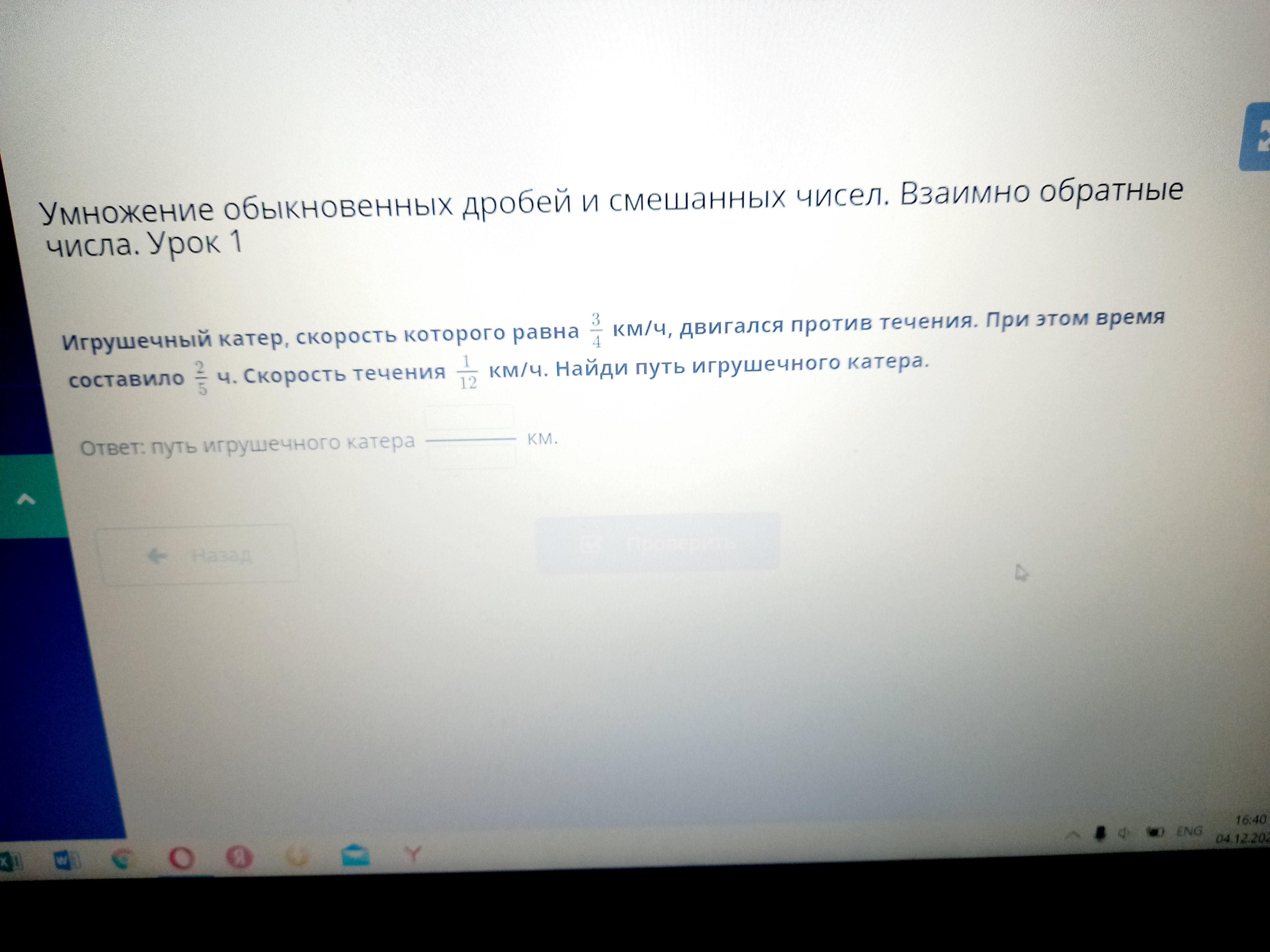 Игрушечный катер, скорость которого равна 3/4 км / ч, двигался против течения. При этом время составило 2/5 ч. Скорость течение 1/12 км / ч. Найди путь игрушечного катера.
