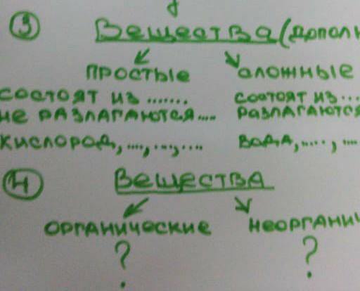 Органические вещества — соединения углерода. В их состав могут также входить атомы водорода, кислорода, азота, фосфора, серы. ... Неорганические вещества — соединения всех остальных элементов. К ним относятся также некоторые вещества, содержащие углерод: сода, мел, угарный и углекислый газы и др.