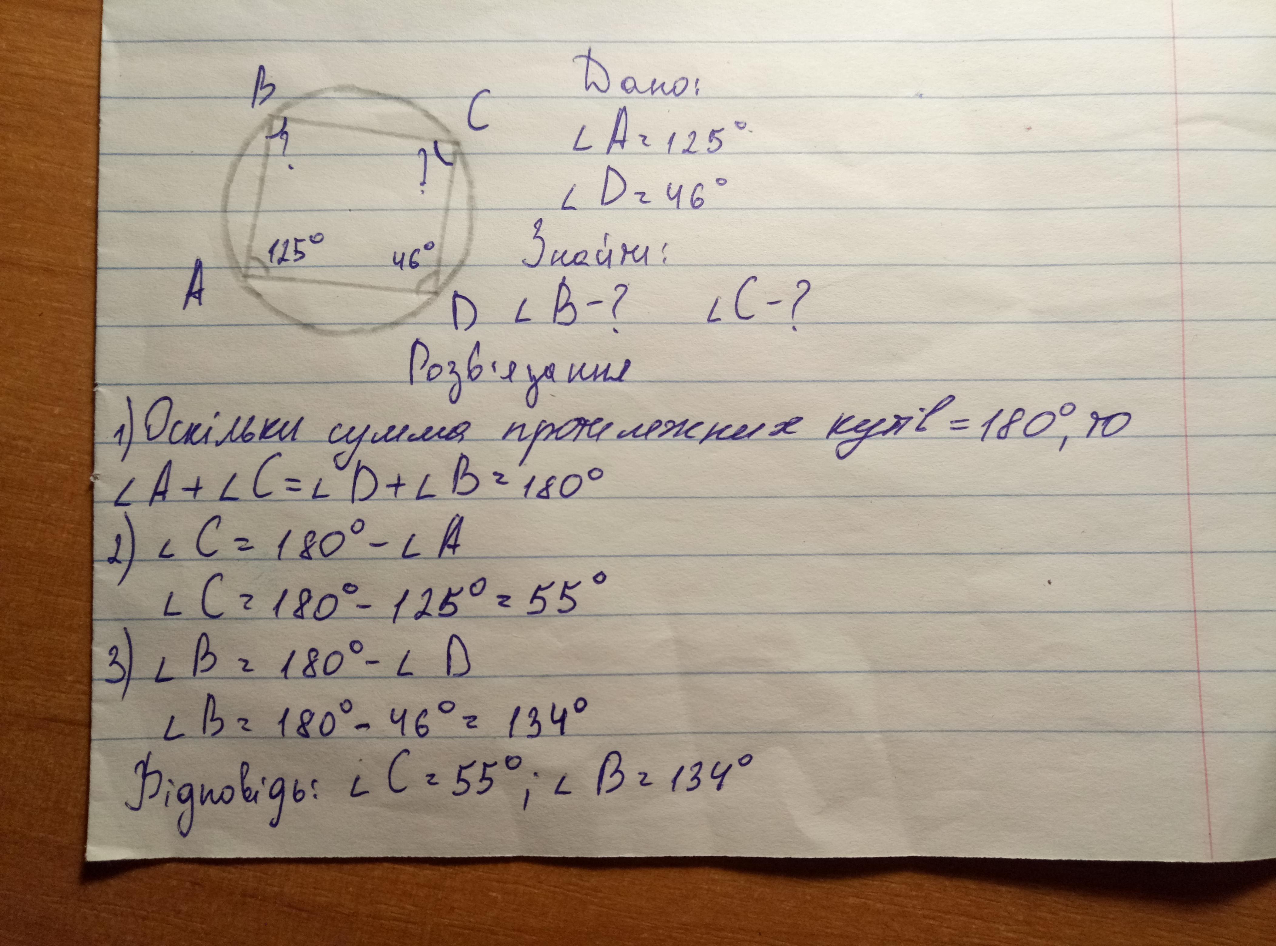 Вписаного чотирикутника, якщо два його кути дорівнюють 46° і 125°