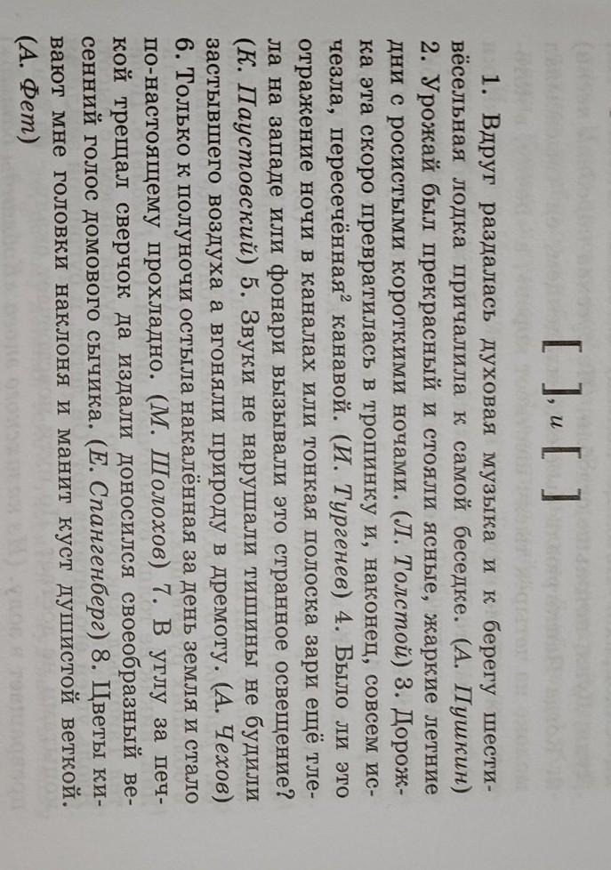 ССП: 1. Вдруг раздалась духовая музыка, и к берегу шестивёсельная лодка причалила к самой беседке. 2. Урожай был прекрасный, и стояли ясные, жаркие летние дни с росистыми короткими ночами. 4. Было ли это отражение ночи в каналах, или тонкая полоска зари еще тлела на западе, или фонари вызывали это странное освещение? 6. Только к полуночи остыла накаленная за день земля, и стало по-настоящему прохладно. 7. В углу за печкой трещал сверчок, да издали доносился своеобразный весенний голос домового сычика. 8. Цветы кивают мне, головки наклоня, и манит куст душистой веткой.