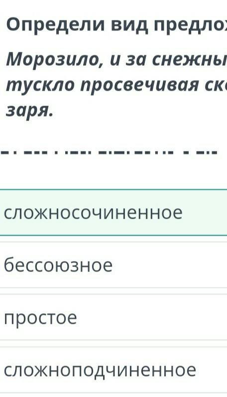Определи вид предложения. Морозило, и за снежными полями, на западе, тускло просвечивая сквозь тучи, желтела заря.