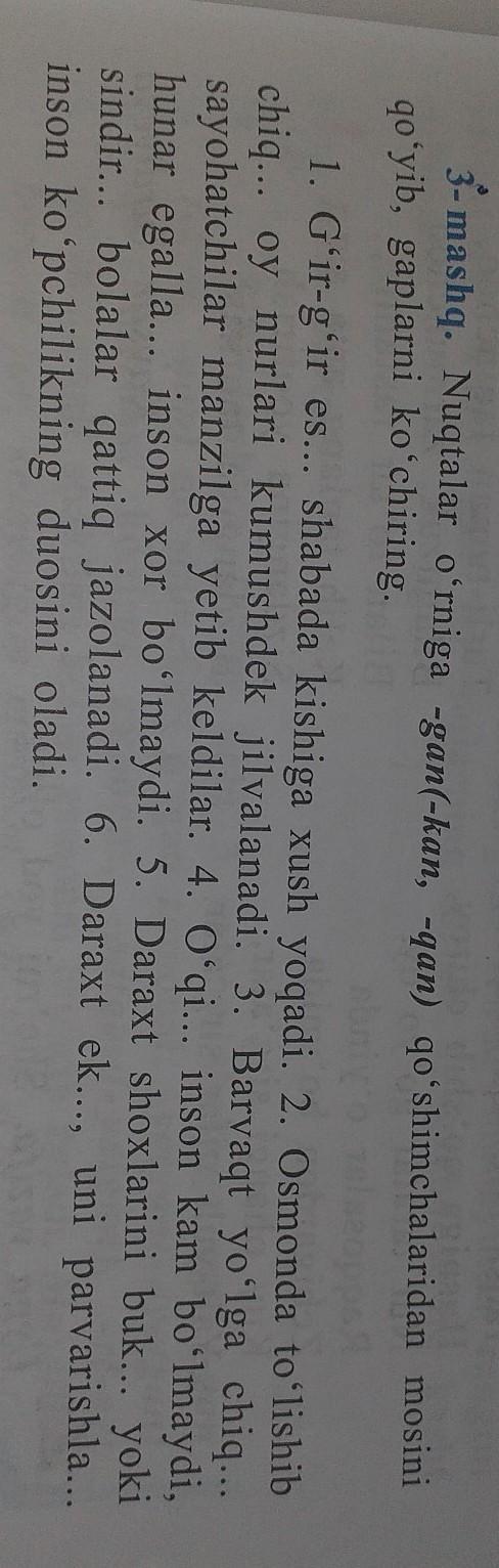 Nuqtalar o'rniga -gan(-kan,-qan) qo'shimchalaridan mosini qo'yib, gaplarni ko'chiring