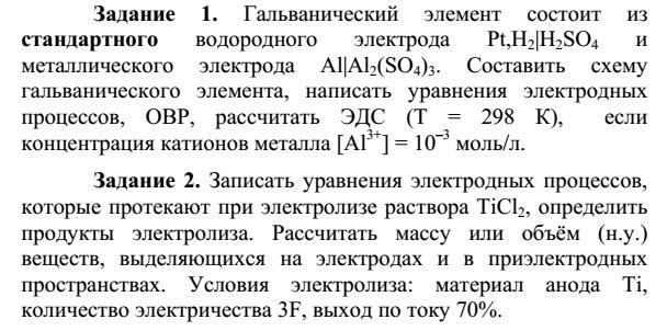 Задание 2. Записать уравнения электродных процессов, которые протекают при электролизе раствора TiCl2, определить продукты электролиза. Рассчитать массу или объём (н.у.) веществ, выделяющихся на электродах и в приэлектродных пространствах. Условия электролиза: материал анода Ti, количество электричества 3F, выход по току 70%.