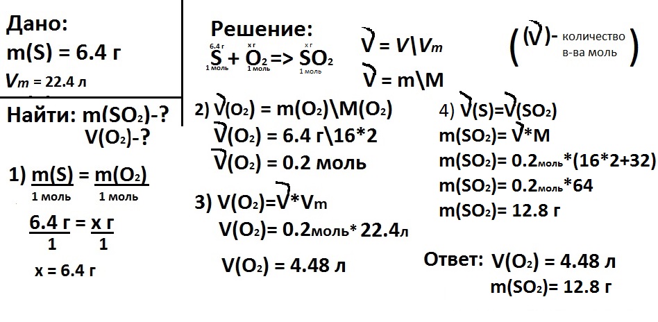 Рассчитать объем кислорода нормального условия, который расходуется при полном сгорании 6.4г. серы. Сколько г. оксида серы (4) образуется при этом?