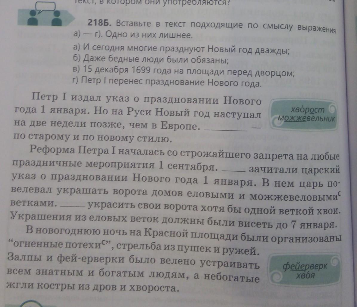 218Б. Вставьте в текст подходящие по смыслу выражения
