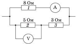 На рисунке представлена схема участка электрической цепи. Воспользовавшись данным рисунка, определите показ амперметра, если вольтметр показывает 5 В. В ответе записать число и через пробел единицу измерения.