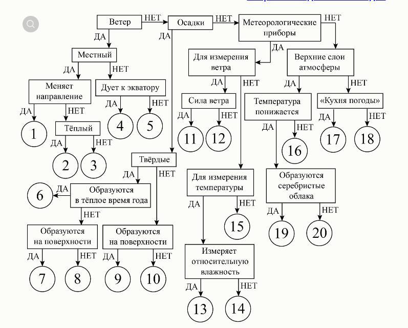 Согласно предложенному алгоритму, установите соответствие между словами в списке метеорологических понятий и конечными числами в лабиринте.
