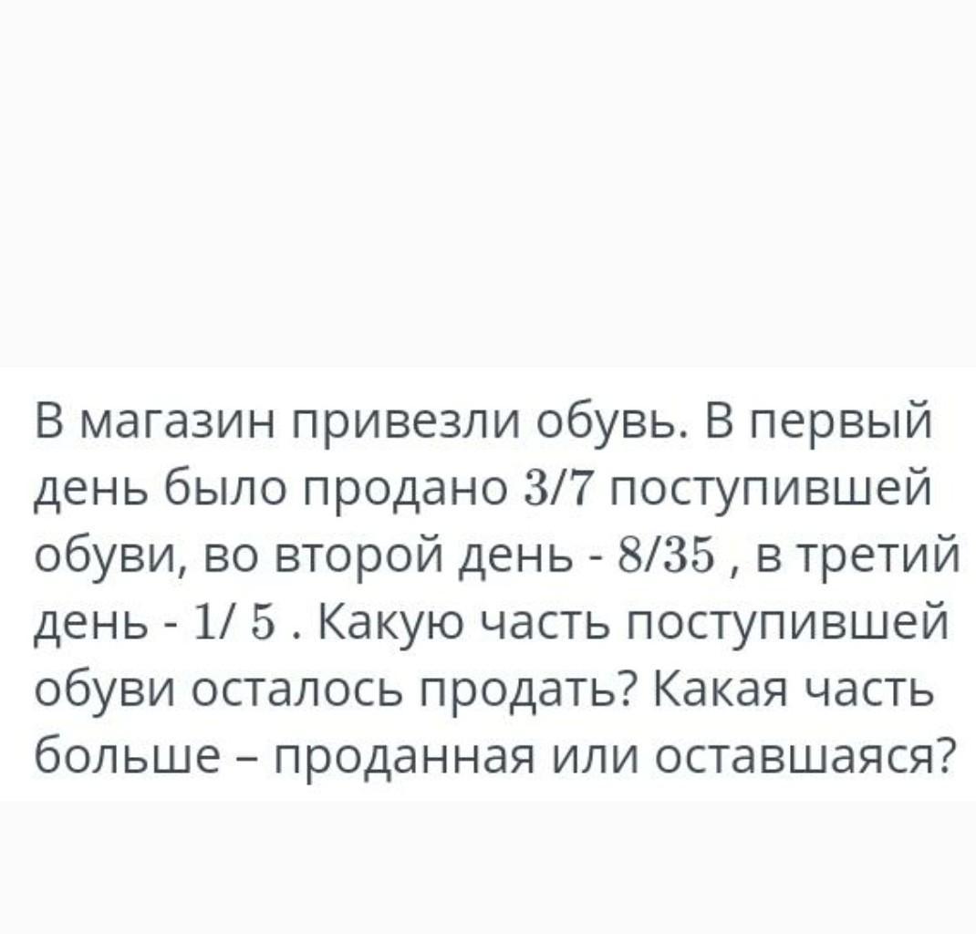 2)15/35 + 7/35 + 8/35 = 30/35 - всего продали обуви
