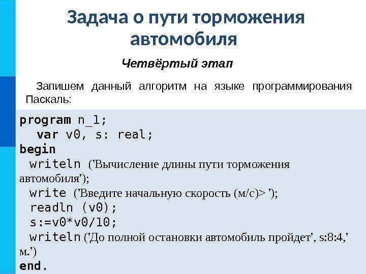задача о пути торможения автомобиля дана на языке Паскаль, как ее записать, используя Питон?