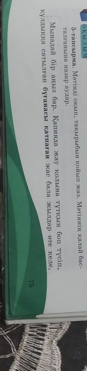 . 5-тапсырма. 75-бет Оқылым тапсырмасы, Мәтінді оқып тақырыбын қойып, қарамен берілген сөздерді мағынасын жаз