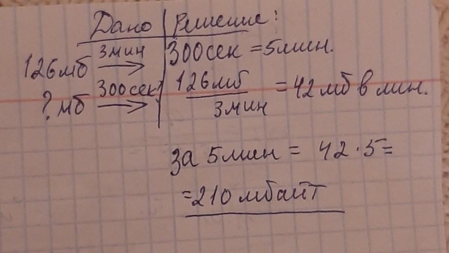 Файл размером 126 Мбайт передаётся через некоторое соединение за 3 минуты. Определи размер файла (в Мбайт), который можно передать через это же соединение за 300 секунд.