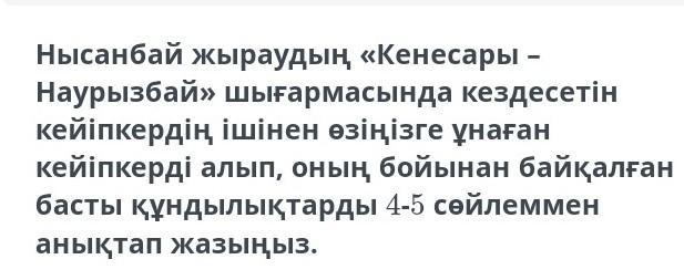 Ол үшін мына Кенесары Наурызбай шығармасын мұқият оқуыңыз керек.Және сол шығармадан бір кейіпкер таңдап,сипаттап жазасыз