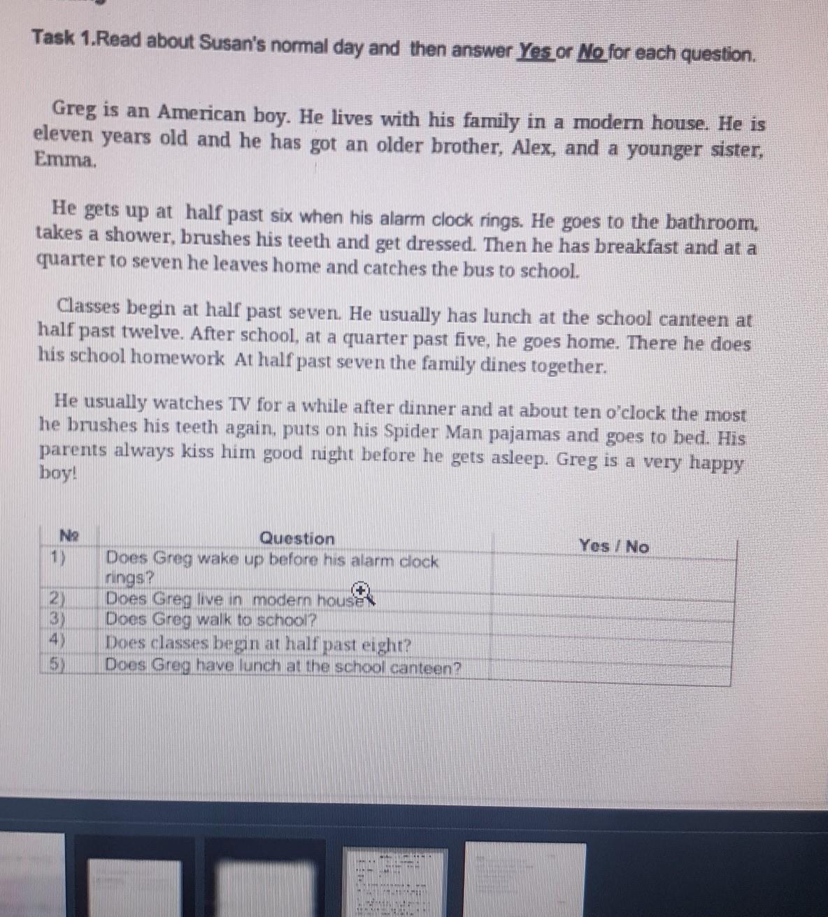 Task 1.Read about Susan's normal day and then answer Yes or No for each question.