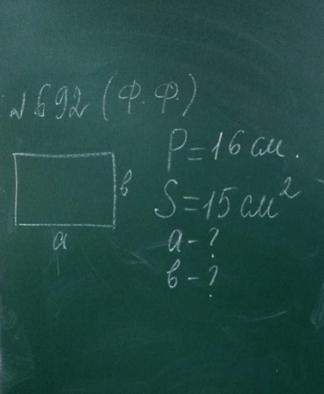 4. т.к. это прямоугольник стороны не равны, предположим что а=3, тогда в=5 (т.к. а+в=8) Проверка 3×5=15 (Площадь) (3+5)×2=16 (Периметр)