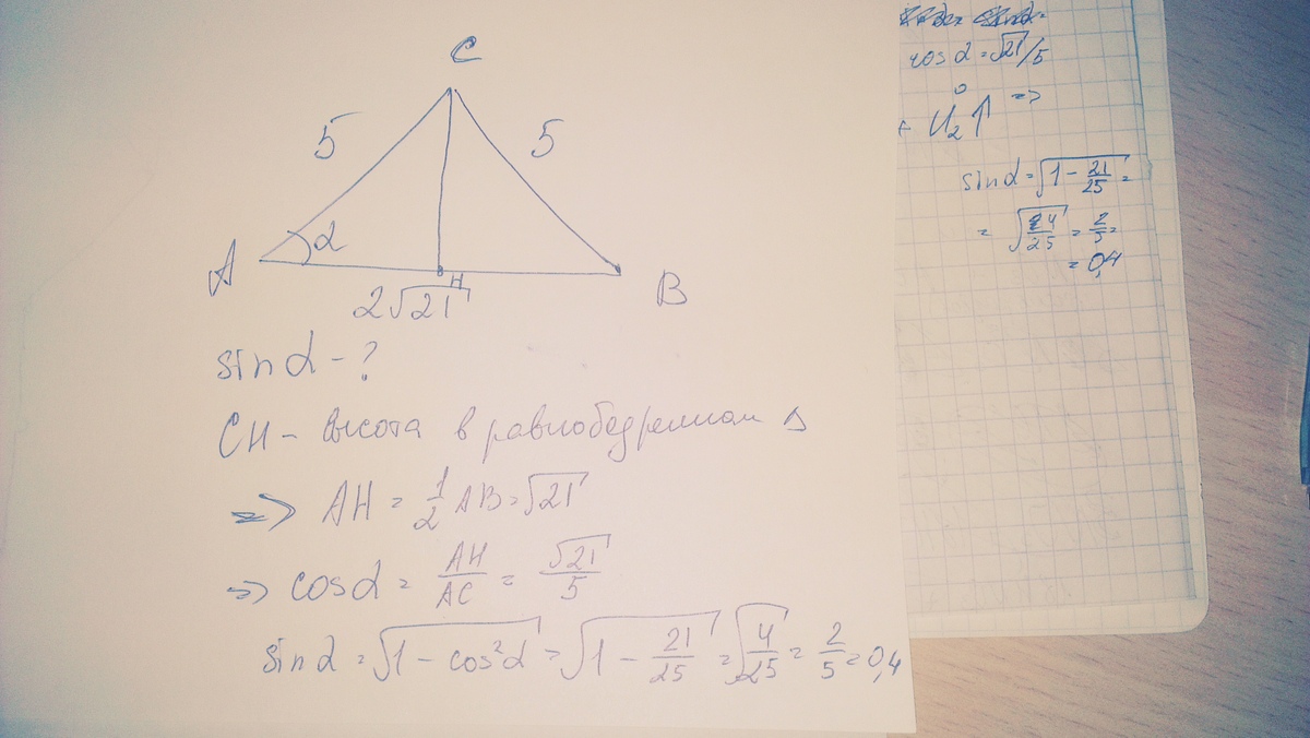 В треугольнике ABC стороны AC и BC равны 5, AB=2 корень из 21. Найдите sin A