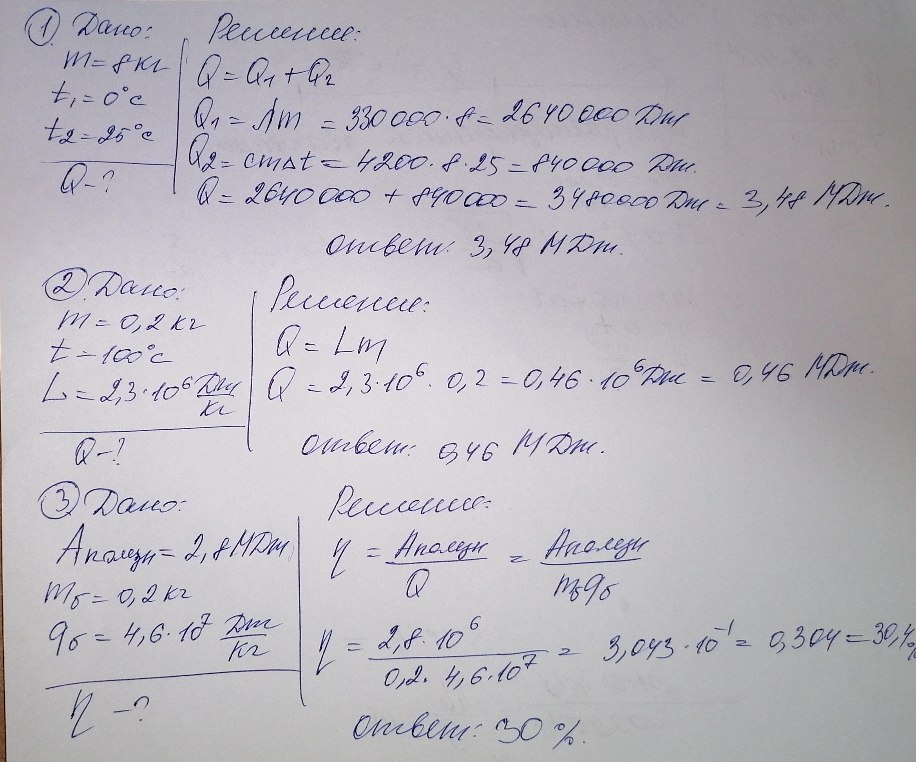 1.Какое количество теплоты необходими затратить, чтобы 8 кг льда, взятого прр температуре 0°С превратить в воду, а воду нагреть до 25°С? Потерями пренебречь.