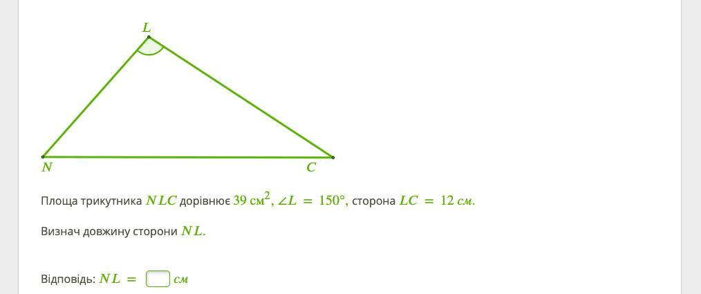 NL = S треугольника NLC / LC * sin NLC = 39 / 12 * sin(150)